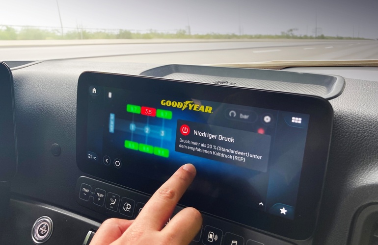 Der Reifenhersteller Goodyear integriert seine DriverHub App in das Mercedes-Benz Truck App Portal. Sie bietet Lkw-Fahrern und Flottenbetreibern in Echtzeit kontinuierlich präzise Reifendaten für die Optimierung ihres Reifenmanagements. Sobald Abweichungen von den Voreinstellungen für Reifendruck und -temperatur entdeckt werden, zeigt die App Warnmeldungen und Benachrichtigungen an.