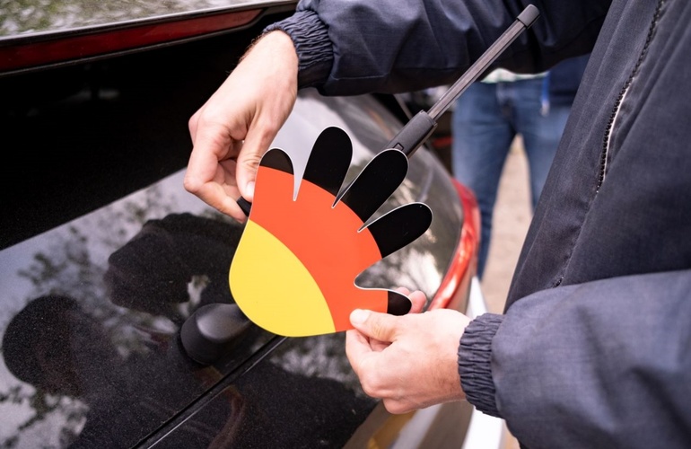 Zur anstehenden Fußball-EM stehen Dekoartikel auch für das Auto hoch im Kurs. Lösen sie sich aber beim schnellen Fahren vom Fahrzeug, können sie zur Gefahr für den nachfolgenden Verkehr werden.
